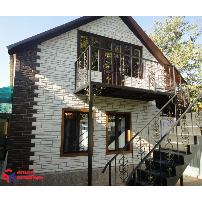 Фасадная панель под камень с комбинацией из набора пластин разной величины коллекции Камень от Альта-Профиль. Панель изготовлена из полипропилена методом литья под давлением, имеет небольшой вес, поэтому не создает дополнительной нагрузки на несущие конструкции. Материал устойчив к грибку, плесени и коррозии. За счет ребер жесткости и увеличенной толщины (23 мм), панели устойчивы к механическим и температурным воздействиям, не деформируются. Многослойное окрашивание надежно защищает от УФ-лучей, обеспечивая сохранность цвета долгие годы.
