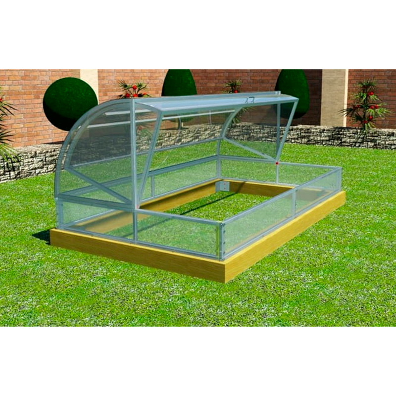 Каркас парника выполнен из оцинкованной профильной трубы сечением 20х20 см. В качестве покрытия использован сотовый поликарбонат толщиной 4 мм. Парник состоит из боковых створок и основания высотой 20 см. Боковые створки, поднятие и опускание которых производится за счет шарнирных элементов, позволяют регулировать микроклимат внутри парника. а также обеспечивают удобный доступ к любой части конструкции. Конструкция имеет 6 продольных стяжек, усиливающих каркас, а также специальный поддерживающий ролик, который исключает провисание верхней створки парника.