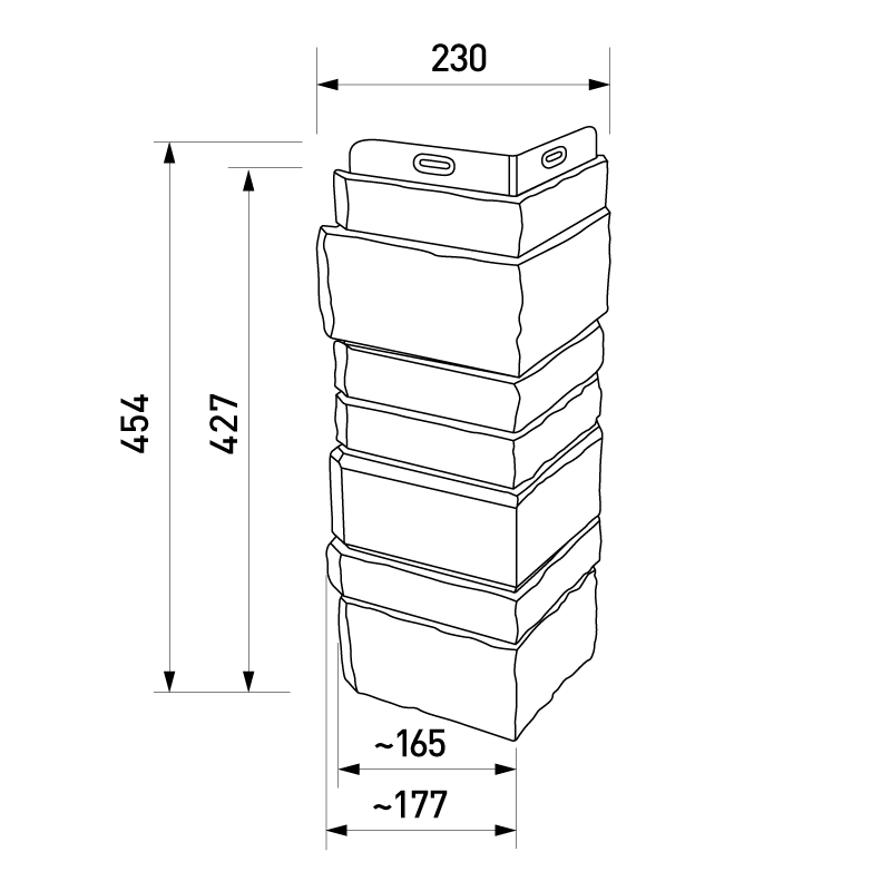 Внешний угол для фасадной панели под колотый слоистый песчаник с переливающейся текстурой поверхности Docke STERN длиной 427 мм. Предназначен для оформления наружных углов и отдельных архитектурных элементов фасада. Скрывает места угловых стыков фасадных панелей, защищает от проникновения влаги. Производятся углы из полипропилена и идентичны по структуре и цвету фасадным панелям Docke STERN.