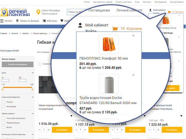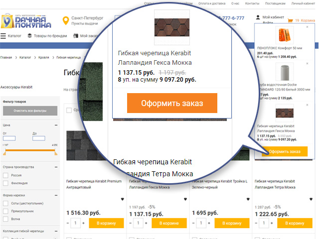 После того, как необходимые товары выбраны, вы можете просмотреть их, перейдя в Корзину, либо сразу перейти к оформлению заказа нажатием на кнопку «Оформить заказ» внизу выпадающего списка Корзины.